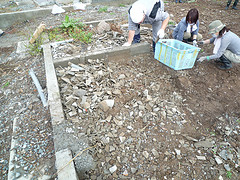 昨日降り続けた雨も、夜のうちにすっかり上がり、その日の作業は何の問題もなく行われました。前日は作業ができなかったので、参加者の皆さんのやる気が満ち溢れていることが伝わってきました。現場は田尻という海の近くにある土地で、壊れずに残った門構えなどから、かつては家が立ち並ぶ場所であったことを推し量ることができます。ですが、それ以上に目を引く、バラバラのコンクリート片やガラスなどかつて家だった物が、津波の恐ろしさを伝えてきます。今回の作業は、それら瓦礫の撤去でした。